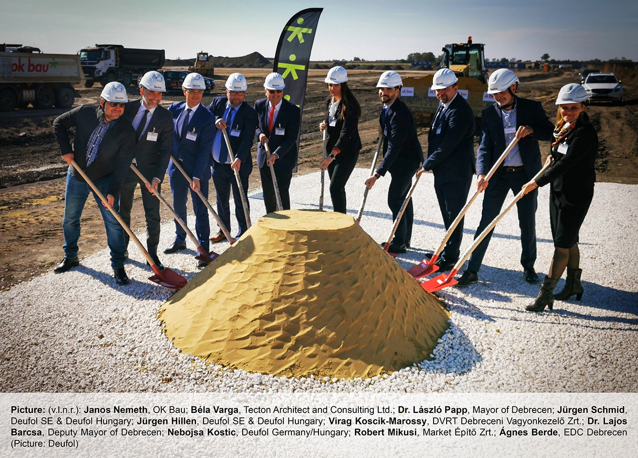 The symbolic ground-breaking ceremony was held at the end of the event by two managing directors of Deufol Hungary, the mayor and deputy mayor of Debrecen, representatives of the local Economic Development Center (EDC) and Debreceni Vagyonkezó (municipal operator of the Southern Industrial Park), as well as the architects’ office (Tecton) and the participating construction companies (OK Bau and Market Èpitö).