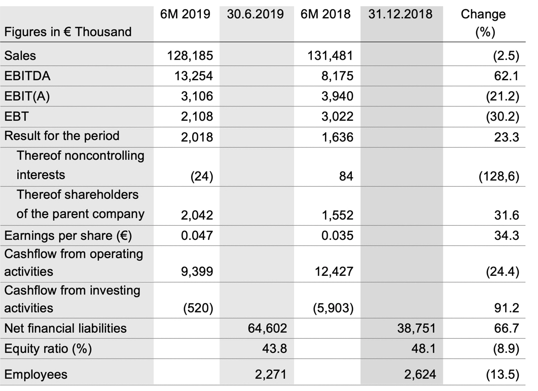 In the first half of 2019, sales were at € 128.2 million, which is 2.5% or € 3.3 million below prior year.  Changes in sales are only partly caused by the challenging global economy. The main cause for the overall reduction were one-off transactions done in 2018 in the automated packing sector in Europe outside Germany.